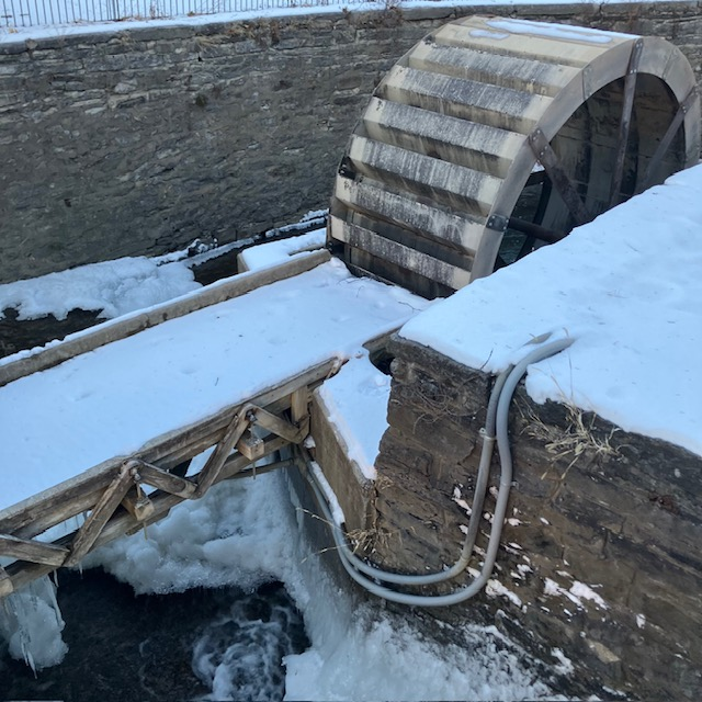 Water wheel in Cobleskill Centre Park frozen in midwinter